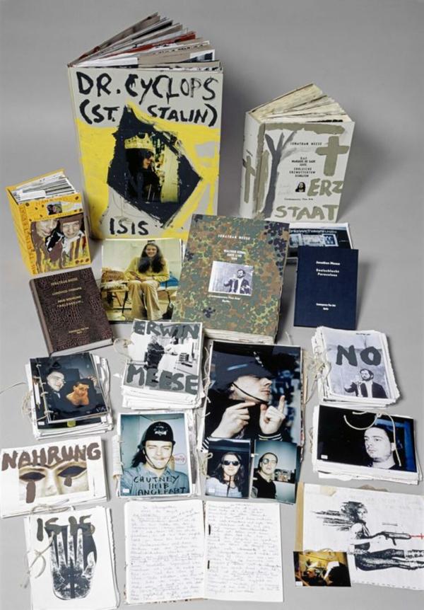 Das Medium Buch spielt im Gesamtwerk von Jonathan Meese eine zentrale Rolle. Die ersten Künstlerbücher entstehen bereits an der Hochschule für bildende Künste in Hamburg. Dort beginnt Meese, eigene Texte zu verfassen und vorzutragen. Aus diesen Lesungen entwickeln sich erste Performances. Meeses serielle Arbeitsweise bringt in der Folge eine Materialfülle hervor, die er in Form von Installationen, Mappen, Büchern und Heften präsentiert. Mit dem Ende der Kunsthochschulzeit ändern sich die Formate und häufig auch das Material der Künstlerbücher. In großen Collagebüchern und Folianten werden Freund*innen und Personen aus der Kunstwelt mit historischen Figuren, Philosoph*innen oder den Held*innen aus Groschenromanen kombiniert. Die stilbildenden Elemente der Künstlerbücher werden auch für die Gestaltung von Sonderausgaben und Ausstellungskatalogen adaptiert.