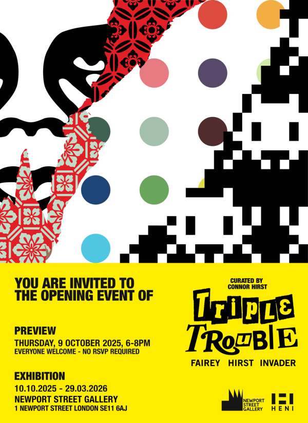 Die Newport Street Gallery präsentiert in Zusammenarbeit mit HENI eine Ausstellung, die drei bahnbrechende Künstler vereint: Shepard Fairey, Damien Hirst und Invader. Die von Connor Hirst kuratierte, beispiellose Ausstellung ist vom 10. Oktober bis zum 29. März 2026 zu sehen und zeigt eine dynamische Mischung aus Einzelwerken und kühnen neuen Gemeinschaftsprojekten, von denen viele zum ersten Mal der Öffentlichkeit präsentiert werden.
