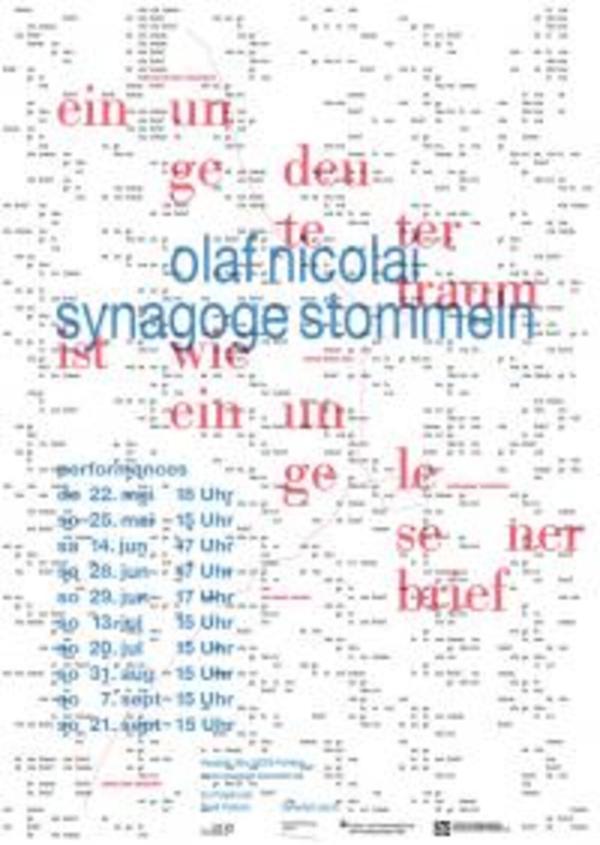 So hat Nicolai für die Synagoge eine ortsspezifische Performance entwickelt, die von einem Zitat aus dem Talmud inspiriert ist – Ein ungedeuteter Traum ist wie ein ungelesener Brief (Berachot 55a). Ausgehend von der Synagoge als sozialer Architektur und Ort der Zusammenkunft, reflektiert Nicolai die Bedeutung der Kommunikation – des Sprechens mit- und zueinander, des Lesens und der Diskussion von Texten und der Deutung von Sprache, die für diesen Ort zentral sind. Das titelgebende Zitat verweist auf diese Aktivität: das Lesen, die Übersetzung und die Übertragung. Zwischen Mai und September performen Sänger und Sängerinnen zehn audio-visuelle Interventionen im Zusammenspiel mit Brieftauben und führen auf poetische Weise vor, was es bedeutet, einen Brief zu lesen.