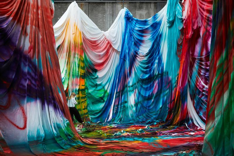 Katharina Grosse, The Horse Trotted Another Couple of Metres, Then It Stopped, 2018, Carriageworks, Sydney, Australien, acrylique sur tissu, 1.000 x 4.600 x 1.500 cm Photo : Zan Wimberley, Courtesy: Carriageworks, Sydney, Australien, and Gagosian © Adagp, Paris 2024